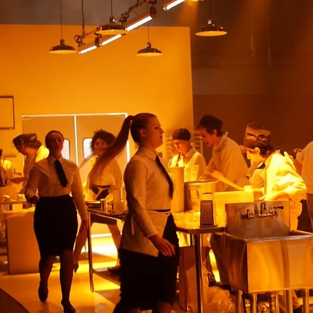 An enormous undertaking with cast of 27 students running a commercial kitchen that runs the 70 foot length of the theatre. With Chris Giarmo on sound, Eric Southern doing lights and clothes by Oana Botez.